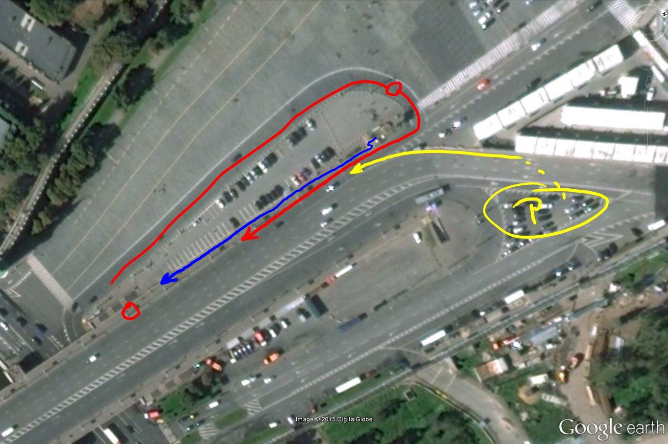 Frame by frame analysis shows that this is the route the 'cleaning car' took: