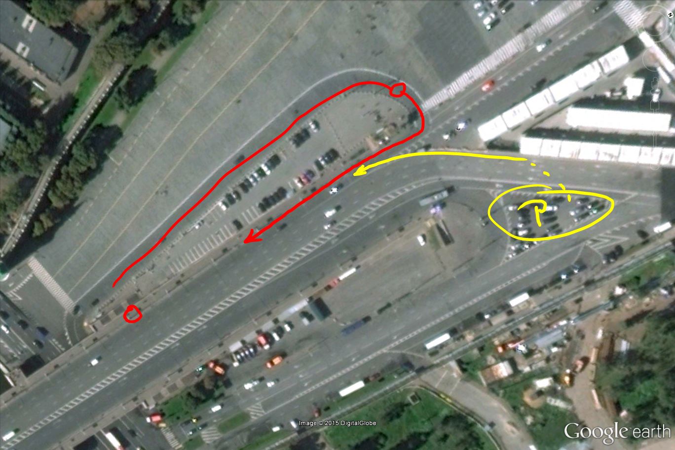 The flee-car came from the right side and not from the road straight towards the bridge: