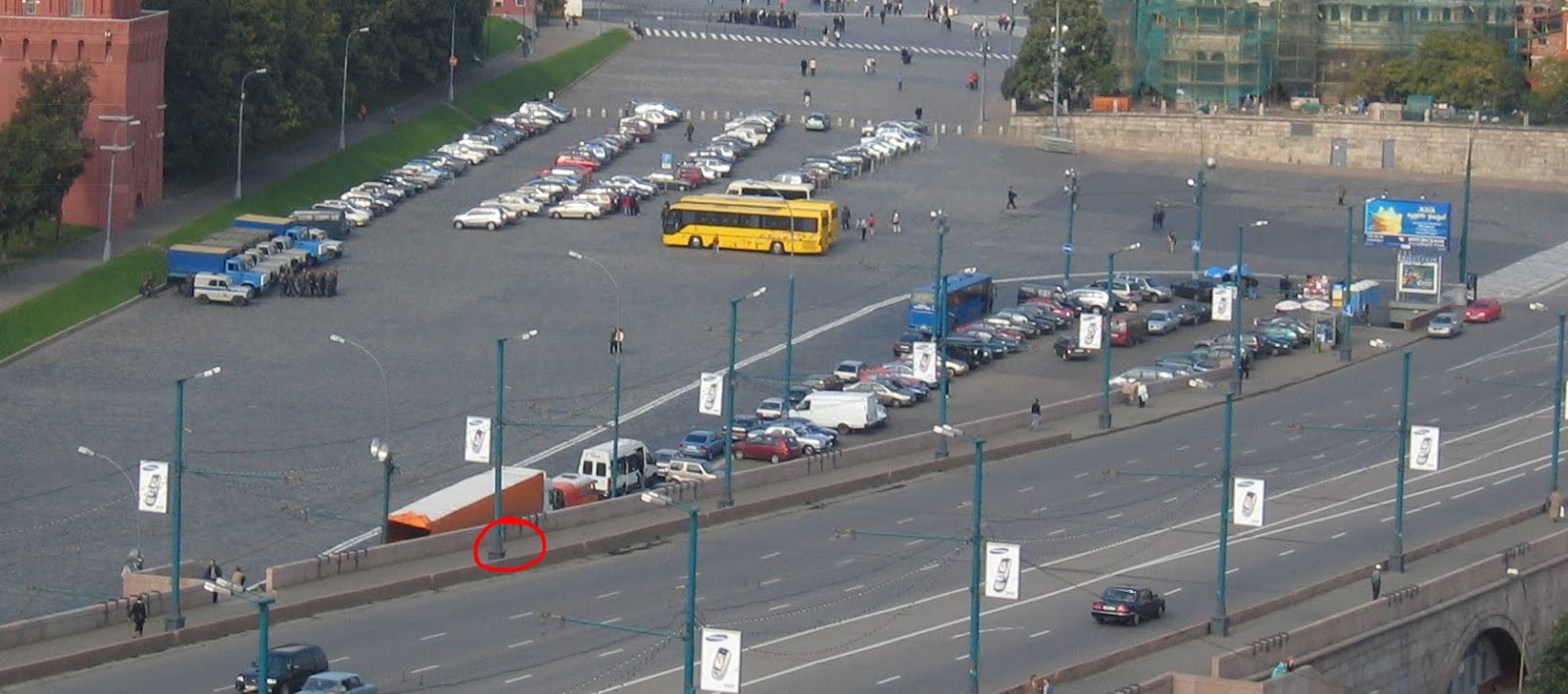 Nobody can be seen walking up the stairs at the side of the bridge and then walking towards Nemtsov and his companion. Two times one or more people can be seen walking up the stairs (and before the attack) continuing their path over the bridge: